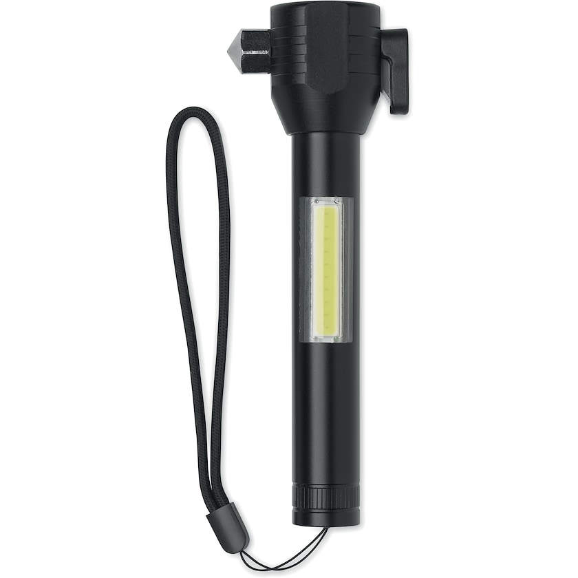 Marteau d'urgence 3 en 1 avec couteau à ceinture et lampe COB. Le marteau d'urgence est doté d'une fixation magnétique et d'une dragonne. Alimenté par une batterie rechargeable intégrée.