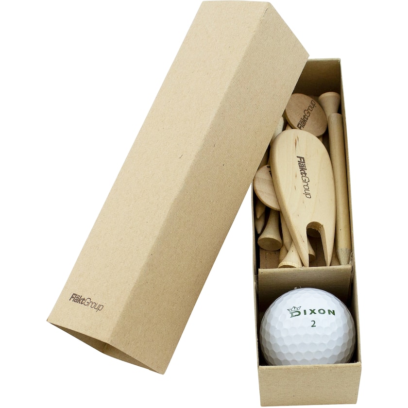 Set contenant différents accessoires de golf. Le set contient une balle de golf écologique de la marque Dixon Earth, 10 tees en bois, 2 boutons de marquage en bois, un crayon à papier et un relève-pitch en bois. Le prix de la personnalisation fait référence à la personnalisation de l'ensemble des éléments ainsi que de la boîte. Impression monochrome uniquement.