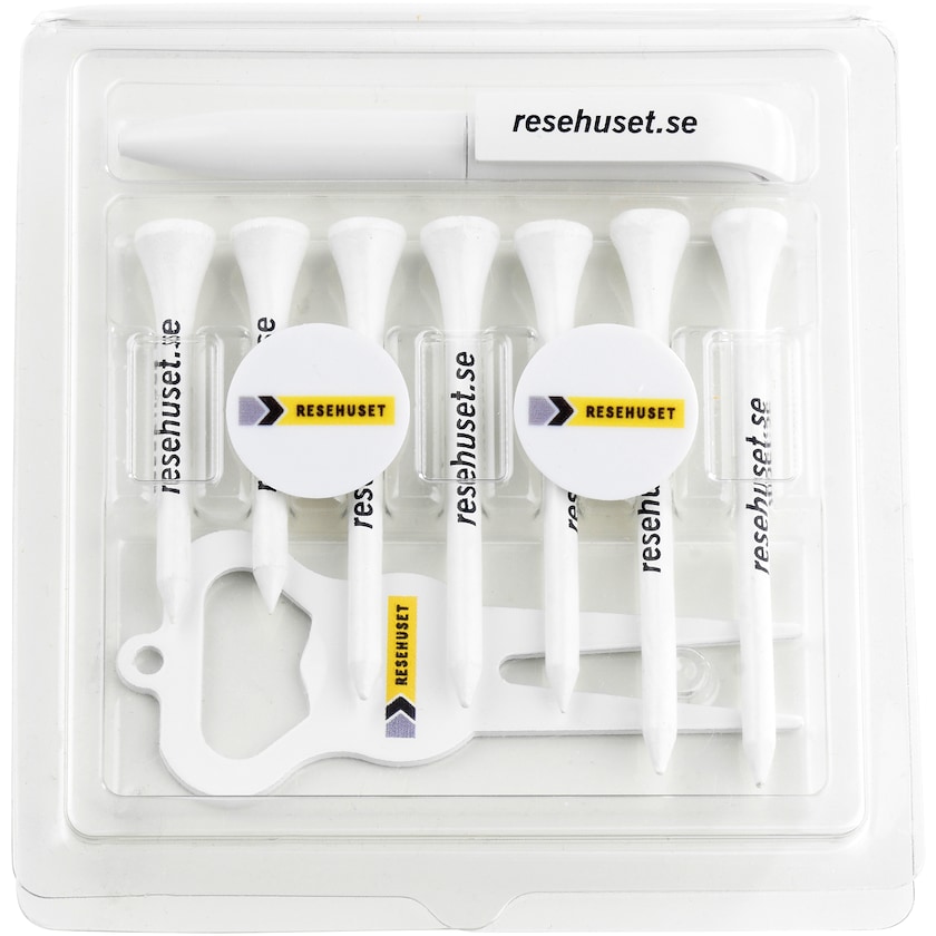 Set d'accessoires de golf dans un joli emballage cadeau. Le set contient sept tees en bois de trois longueurs différentes, deux boutons de marquage, un relève-pitch et un stylo pour marquer les points. La personnalisation est réalisée sur l'ensemble des accessoires de golf.