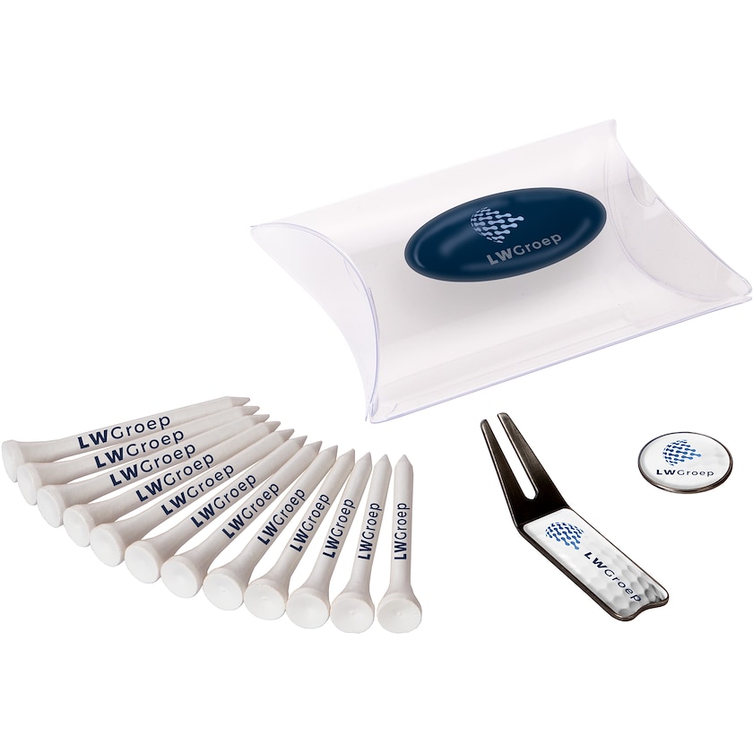 Set contenant des tees de golf, un relève-pitch et un bouton de marquage. La personnalisation est réalisée par impression photo en quadrichromie sur l'emballage, le bouton de marquage, le relève-pitch ainsi que les deux tees de golf. Les tees mesurent 70 mm de long et sont fabriqués en bambou.