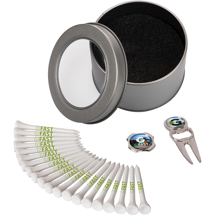 Set de 20 tees de golf, 1 relève-pitch et 1 bouton de marquage. Les tees de golf mesurent 70 mm de haut et sont en bois. Le set est livré dans une jolie boîte cadeau en métal. Les prix de la personnalisation incluent l'impression monochrome sur les tees de golf et l'impression par quadrichromie sur le relève-pitch et le bouton de marquage.