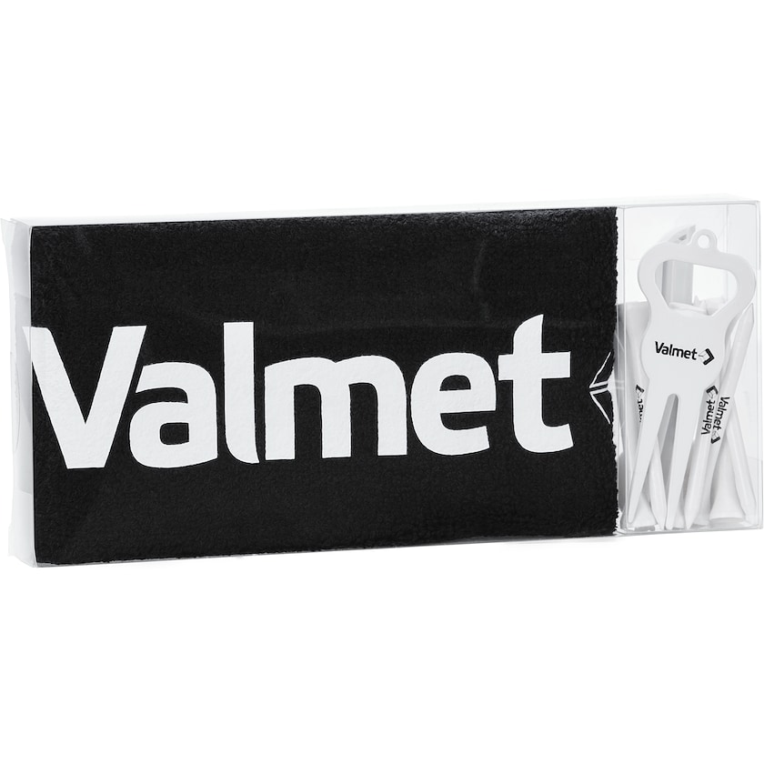 Set contenant différents accessoires de golf. Le set comprend une serviette de golf, dix tees en bois, deux boutons de marquage, un relève-pitch et un stylo pour marquer les points. Tous les produits sont personnalisés avec votre logo.