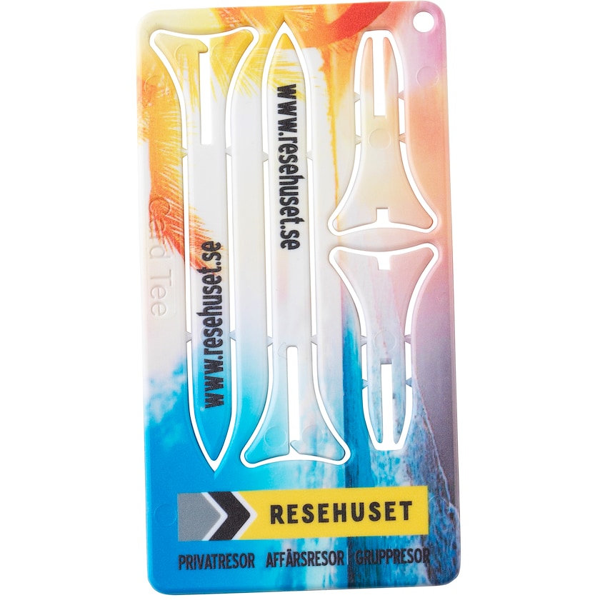 Carte en plastique pouvant former deux tees. Une façon idéale d'inviter au prochain tournoi de golf ! Retirez les différents éléments pour ensuite les assembler en deux tees de golf de 70 mm. Le prix de la personnalisation fait référence à la personnalisation sur l'un des côtés.