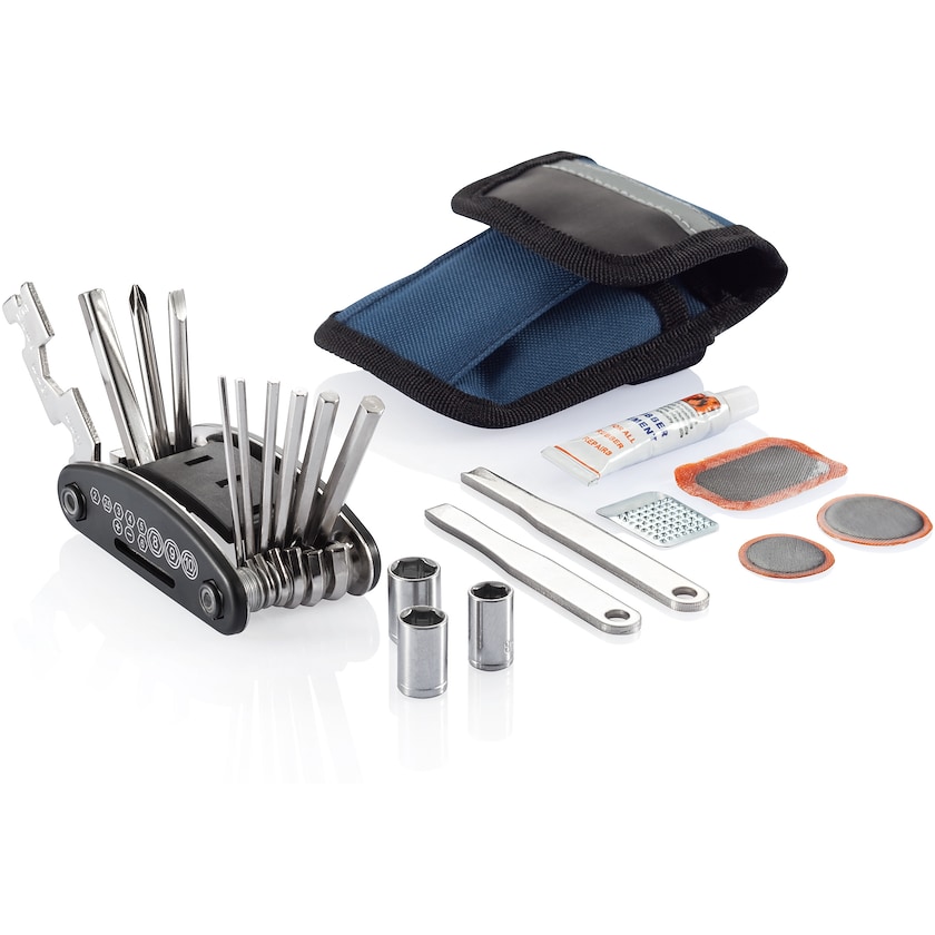 Kit de réparation utile pour vélo. Trousse bleue contenant un kit de réparation pratique pour vélo. Comporte 15 pièces fonctionnelles. Commandez vos kits de réparation personnalisés chez Axon Profil!