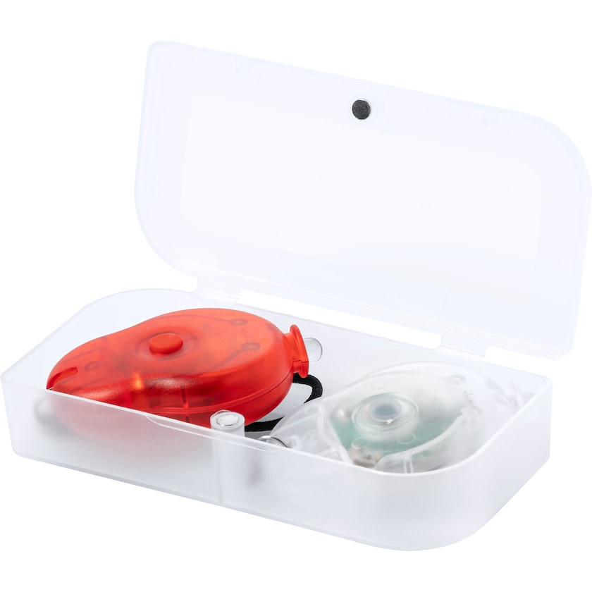 Set de lampes de vélo avant et arrière. Les lampes possèdent deux réglages lumineux. La personnalisation est réalisée sur la boîte en plastique.