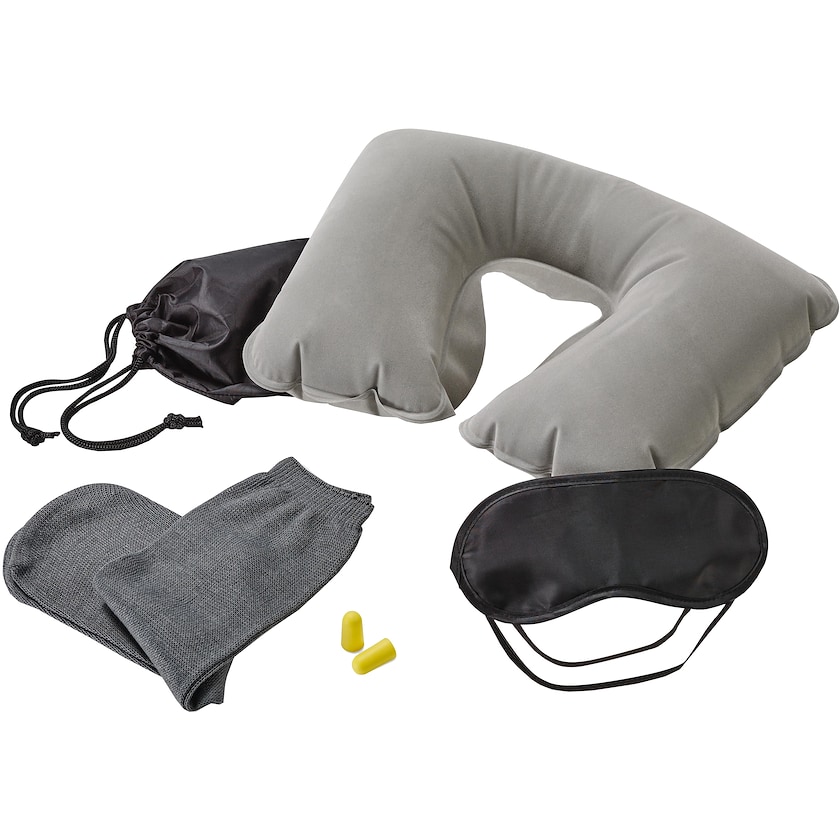 Kit de voyage avec tout le nécessaire pour un voyage agréable. Le kit contient un coussin gonflable, un masque de nuit, des bouchons d'oreille et des chaussettes. Livré dans un étui de rangement noir.