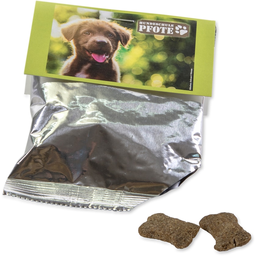 Sachet de friandises pour chien avec une carte avec imprimé personnalisé sur le haut. La carte est personnalisée entièrement suivant vos souhaits. Les friandises pour chien sont fournies par Happy Dog et conviennent aux chiens à partir de 4 mois.