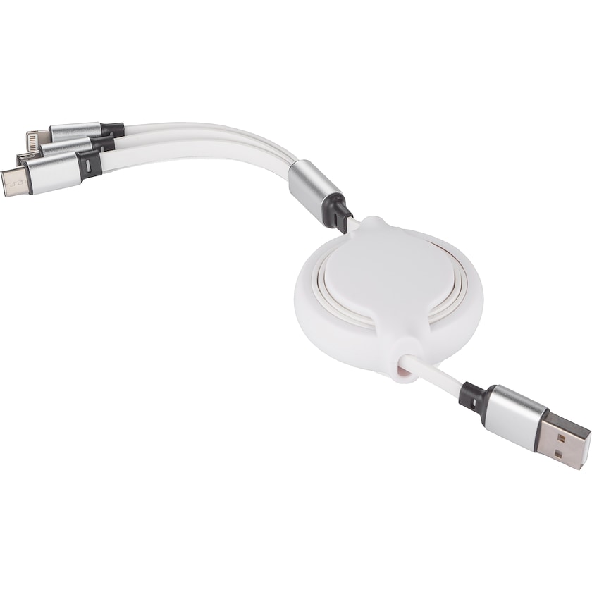 Câble extensible 3 en 1. Possède un port USB C, lightning et micro USB. Extensible jusqu'à 115 cm.