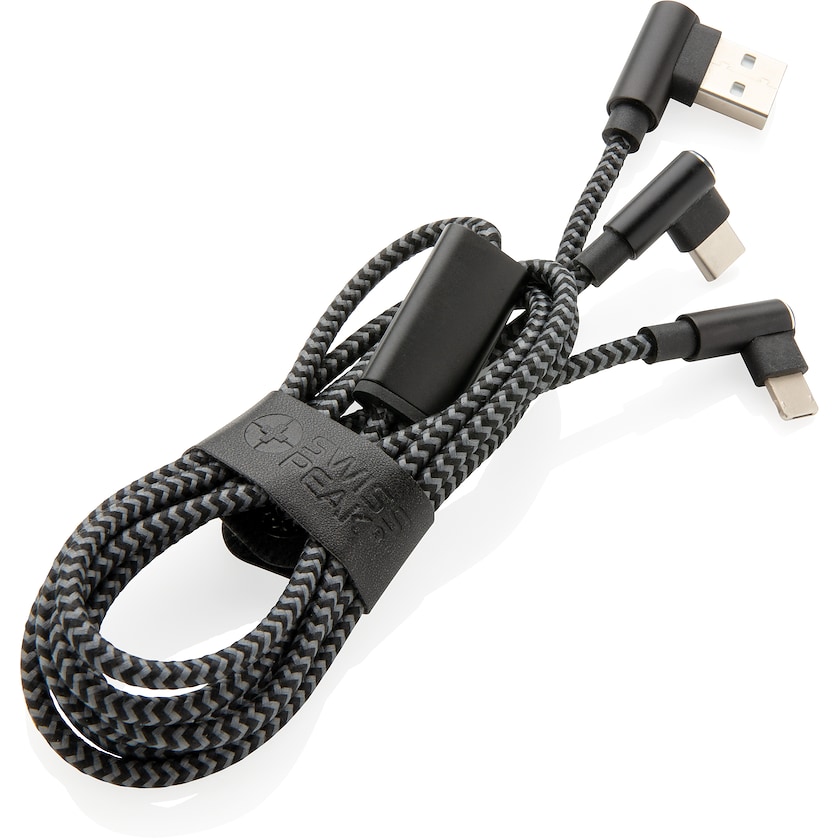 Câble 3-en-1 de première qualité. Le câble est en nylon tressé, les prises en aluminium résistants. Le câble possède une longueur totale de 120 cm. Livré dans une jolie boîte cadeau.