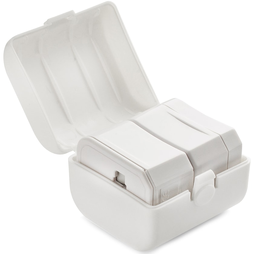 Adaptateur de voyage dans une boîte de rangement pratique. L'adaptateur de voyage Compact possède une combinaison de prise pour la plupart des destinations de voyage. Uniquement avec impression 2 couleurs.