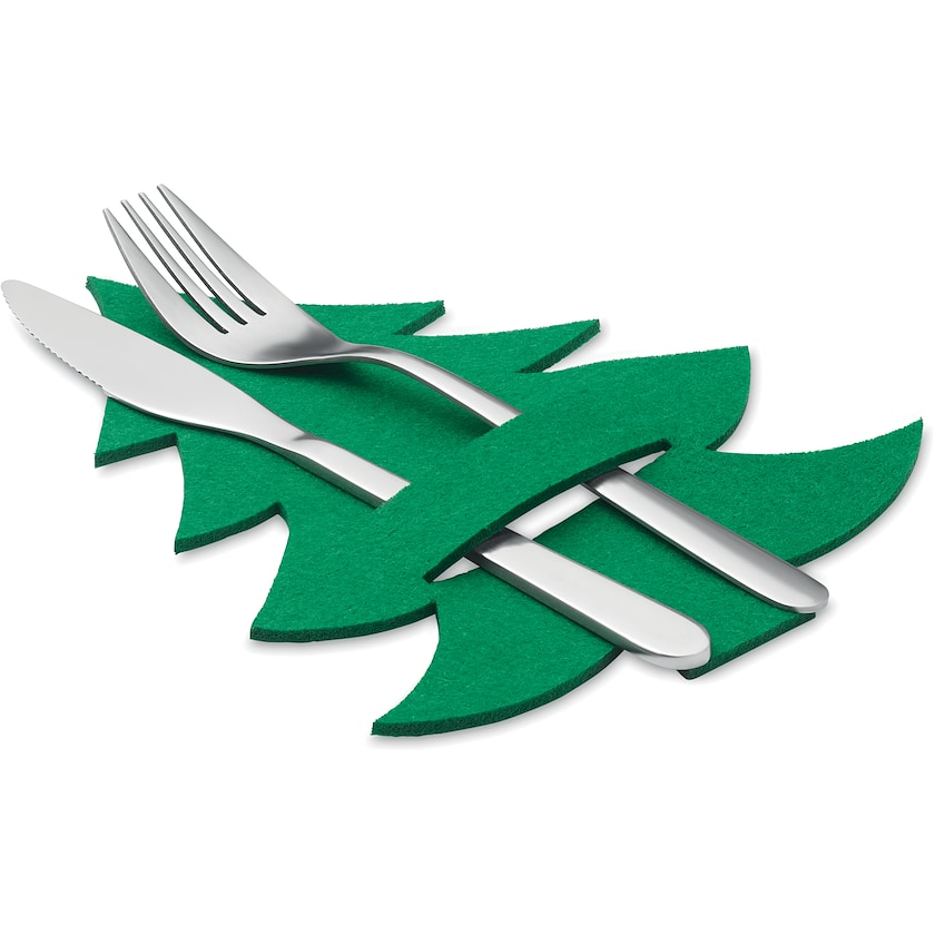 Set de 4 porte-couverts en forme de sapin de Noël. Les porte-couverts sont en rPET, c'est-à-dire fabriqués à partir de bouteilles PET recyclées. L'arrière des porte-couverts présente un symbole pré-imprimé qui indique que les couverts sont en rPET. Pour une belle table de Noël !