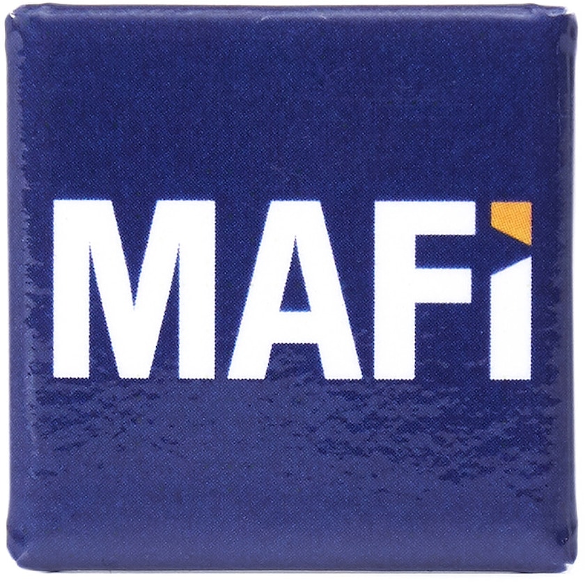 Petit badge bouton publicitaire carré. Le badge possède une épingle de sûreté à l'arrière.