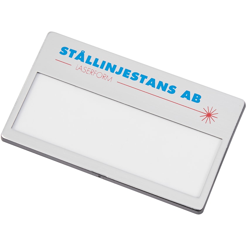 Badge avec un grand espace pour accommoder le nom de son porteur. L'Arena est pourvu d'une épingle de sûreté à l'arrière et est disponible en plusieurs couleurs.