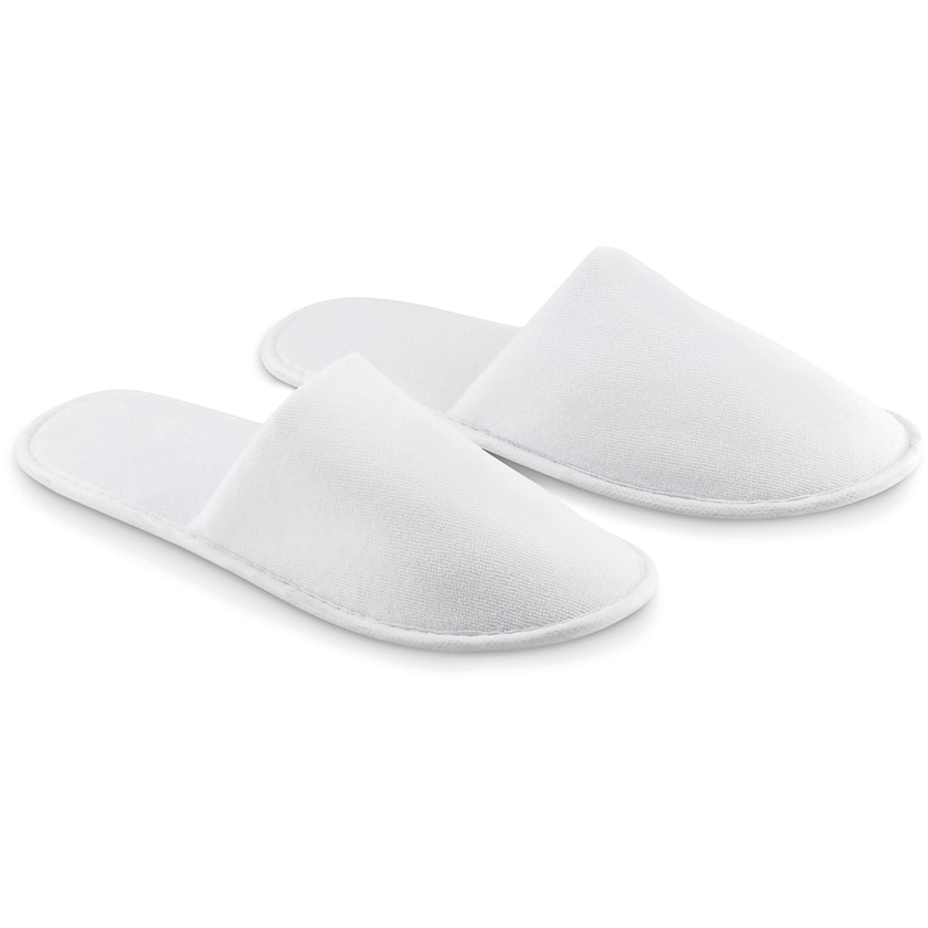 Une paire de chaussons. Les chaussons sont disponibles en taille 44-45 et livrés dans un sac cadeau. Parfaits pour un hôtel ou une auberge de jeunesse. L'impression est réalisée sur un sac cadeau.