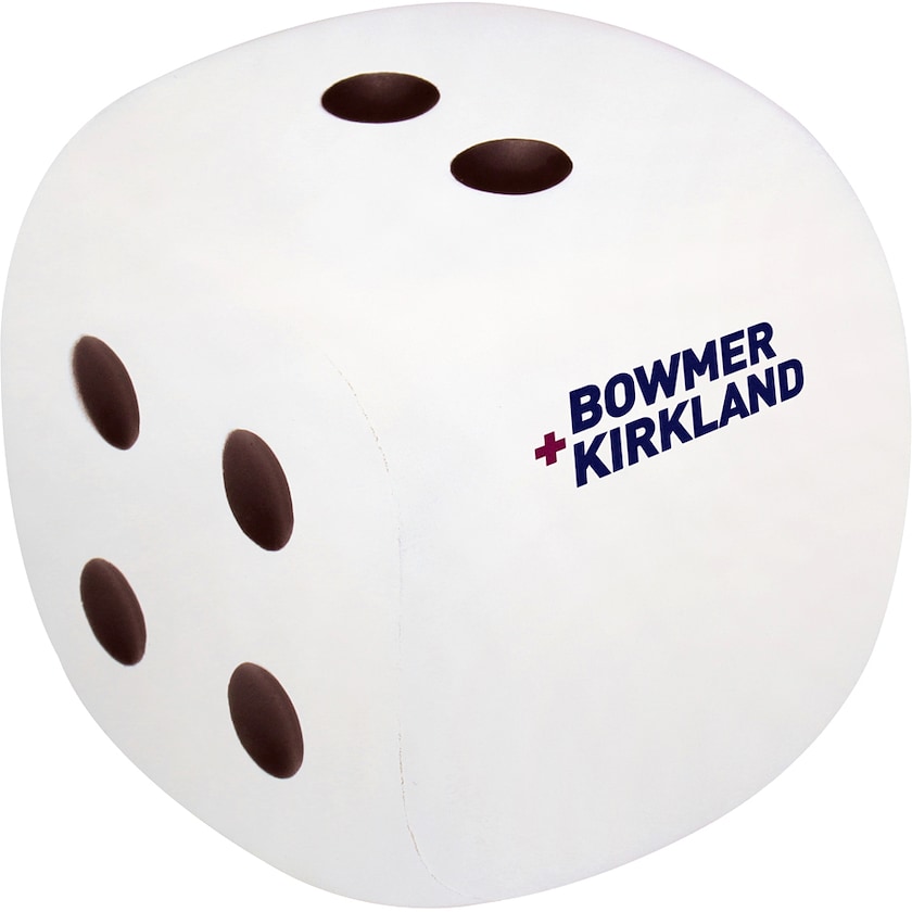 Balle anti stress en forme de dé. La personnalisation est réalisé sur la face où le chiffre 1 serait normalement présent (ce chiffre est donc manquant). L'impression de la personnalisation est de la meilleure qualité.