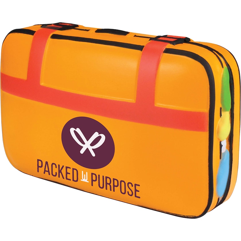 Balle anti-stress en forme de valise classique. Parfaite pour les agences de voyage et les compagnies aériennes. L'imprimé reste intact, même après une longue utilisation.