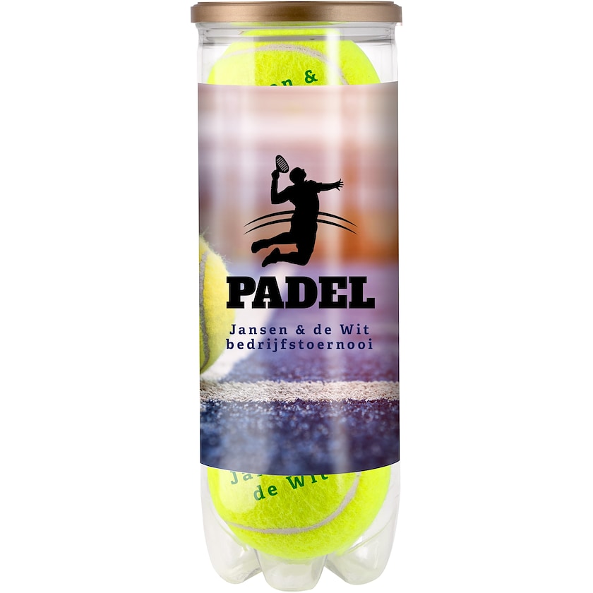 Set de trois balles de padel personnalisées et étiquette assortie. Le prix de la personnalisation fait reference à la personnalisation des trois balles et de l'étiquette. Les balles de padel sont remplies d'air et produites en Europe.