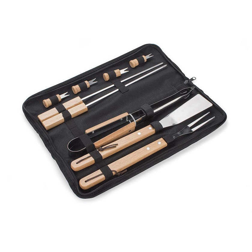 Kit de barbecue haut de gamme dans un étui de rangement pratique. Toutes les pièces sont en bois et acier inoxydable. L'impression est réalisée sur l'étui.