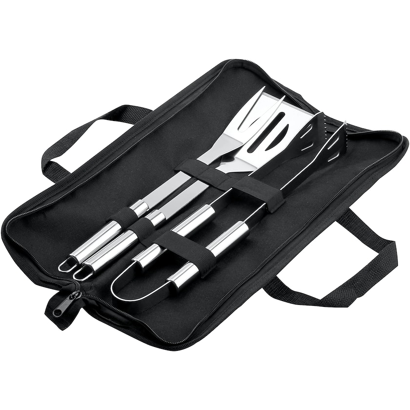 Kit de barbecue économique 3 pièces livré dans un étui de rangement pratique. Contient une fourchette à grill, une spatule et des pinces à barbecue. La personnalisation est effectuée par impression sur l'étui de rangement.