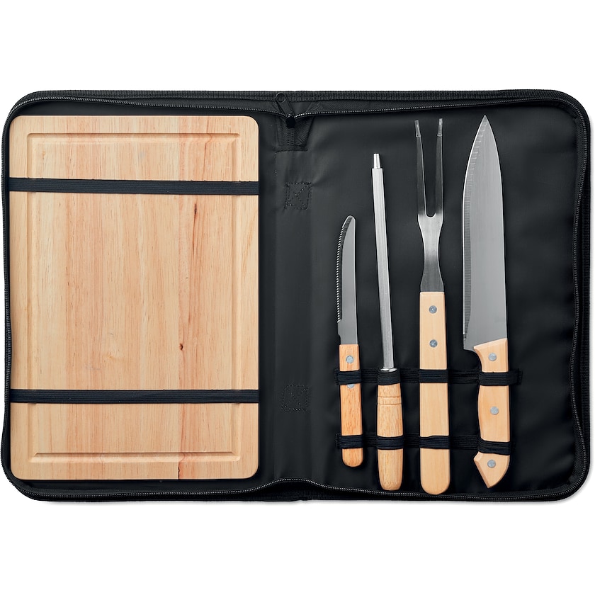 Kit de barbecue pour les soirées barbecue. Le set contient tout le nécessaire pour une soirée barbecue réussie. L'impression est réalisée sur l'étui de rangement, la gravure laser sur la planche à découper.