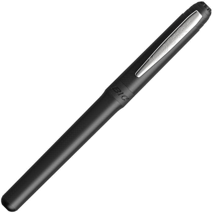 Stylo Bic avec pointe roller ball et barrette chromée.