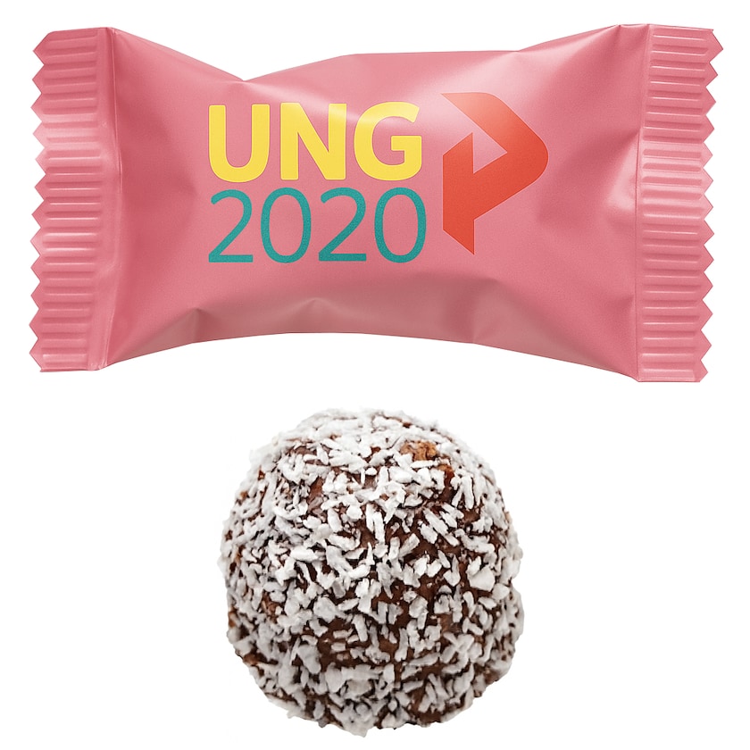 Petite boule de chocolat dans un emballage individuel. La boule de chocolat a un délicieux goût moka avec un nappage chocolat et coco. L'emballage est personnalisé entièrement suivant vos souhaits.
