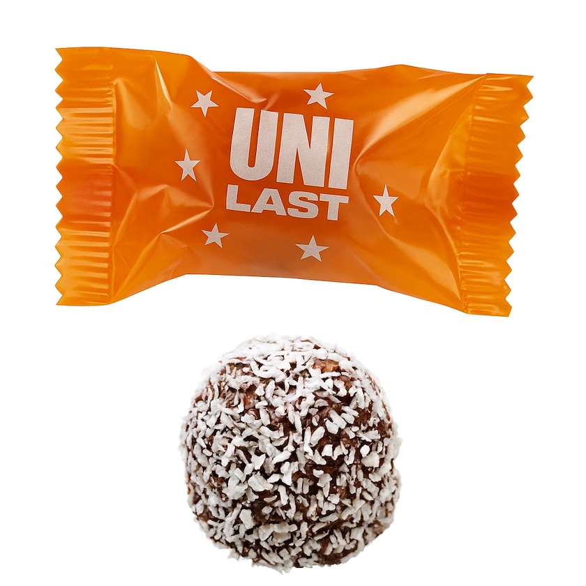 Grande boule de chocolat dans un emballage avec imprimé personnalisé. La boule de chocolat a un délicieux goût moka avec un nappage chocolat et coco. L'emballage est personnalisé entièrement suivant vos souhaits. Un snack parfait.