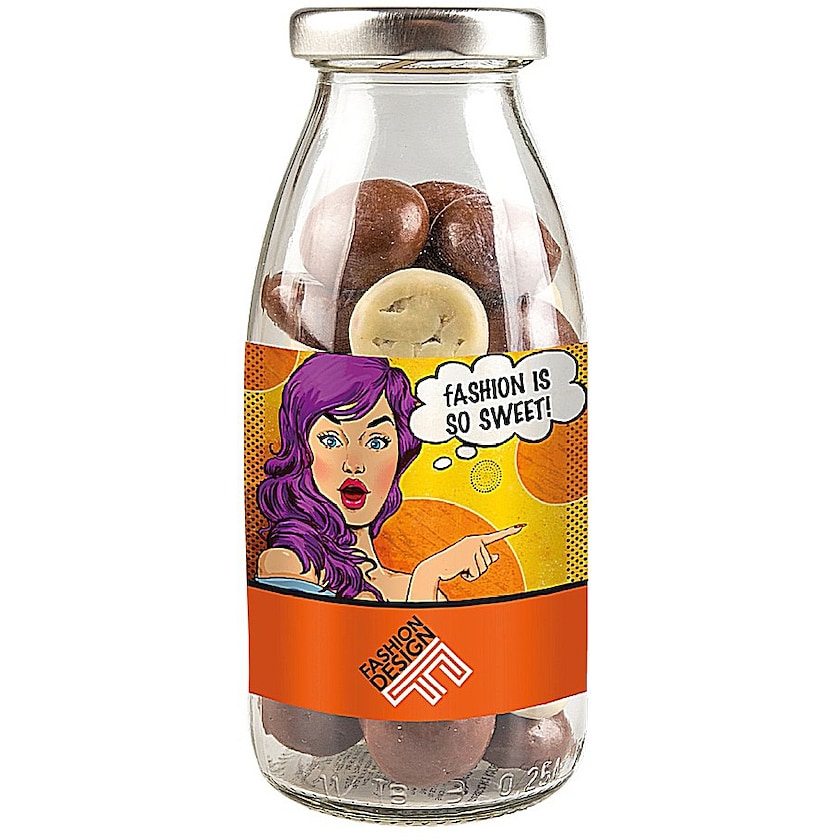 Bouteille remplie de 130 grammes au format mini. La bouteille contient entre autres les parfums lait, blancs et dessert. L'étiquette est personnalisée par impression photo en quadrichromie et est conçue entièrement suivant vos souhaits. Le top du bonbon publicitaire!