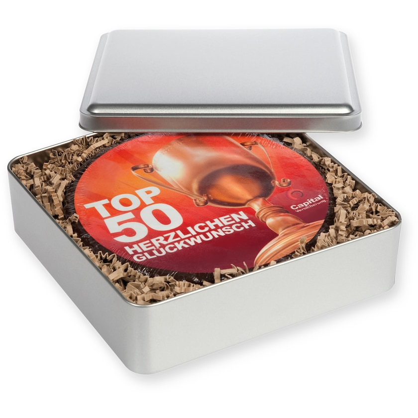 Grand gâteau au chocolat avec imprimé sur le dessus. Toute la face supérieure du gâteau est imprimée avec un photoréalisme complet, entièrement selon vos souhaits. Livré dans une boîte métallique exclusive.
