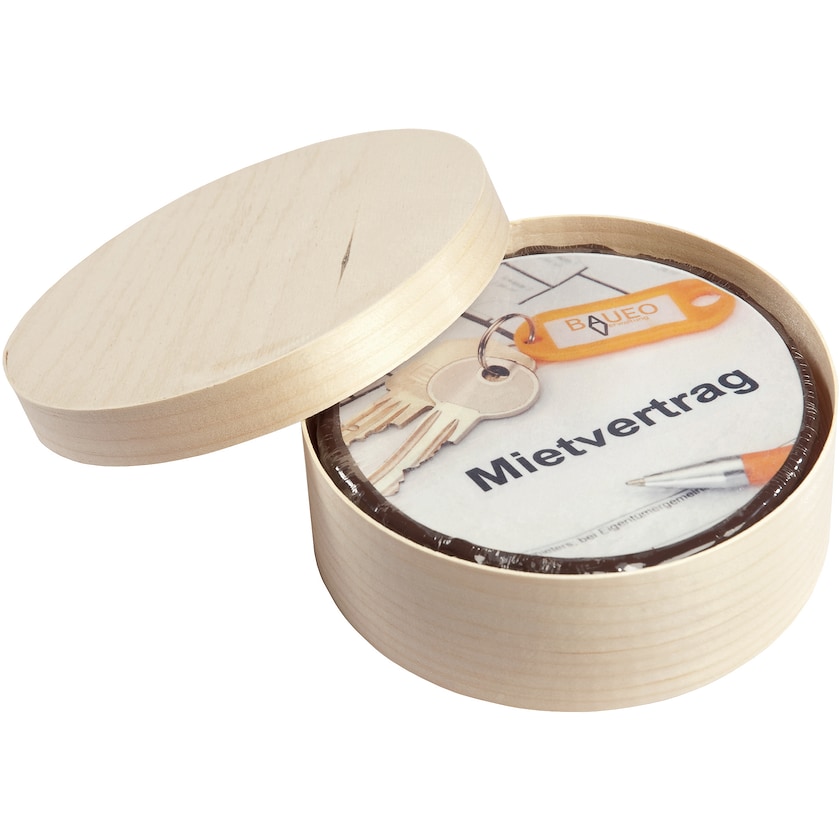 Gâteau avec impression 4 couleurs sur le dessus, livré dans une belle boîte en bois. L'impression est effectuée en colorant alimentaire caramel sur une fine couche de sucre. Le gâteau est disponible dans les goûts chocolat et orange. La durée de consommation possible est indiquée à partir de la date de livraison.