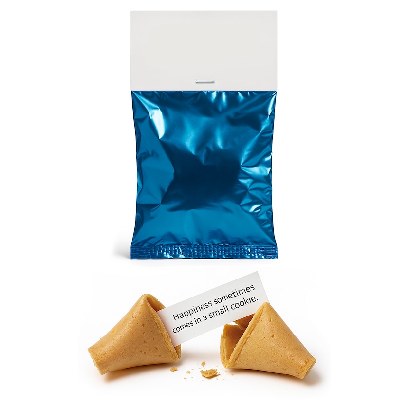 Biscuits chinois dans un emballage scellé imprimé en quadrichromie. L'emballage est disponible en huit couleur différentes (voir photo). Vous composez vous-même jusqu'à 5 messages, qui seront placés dans les biscuits. Chaque message peut comporter jusqu'à 125 caractères, espaces inclus.