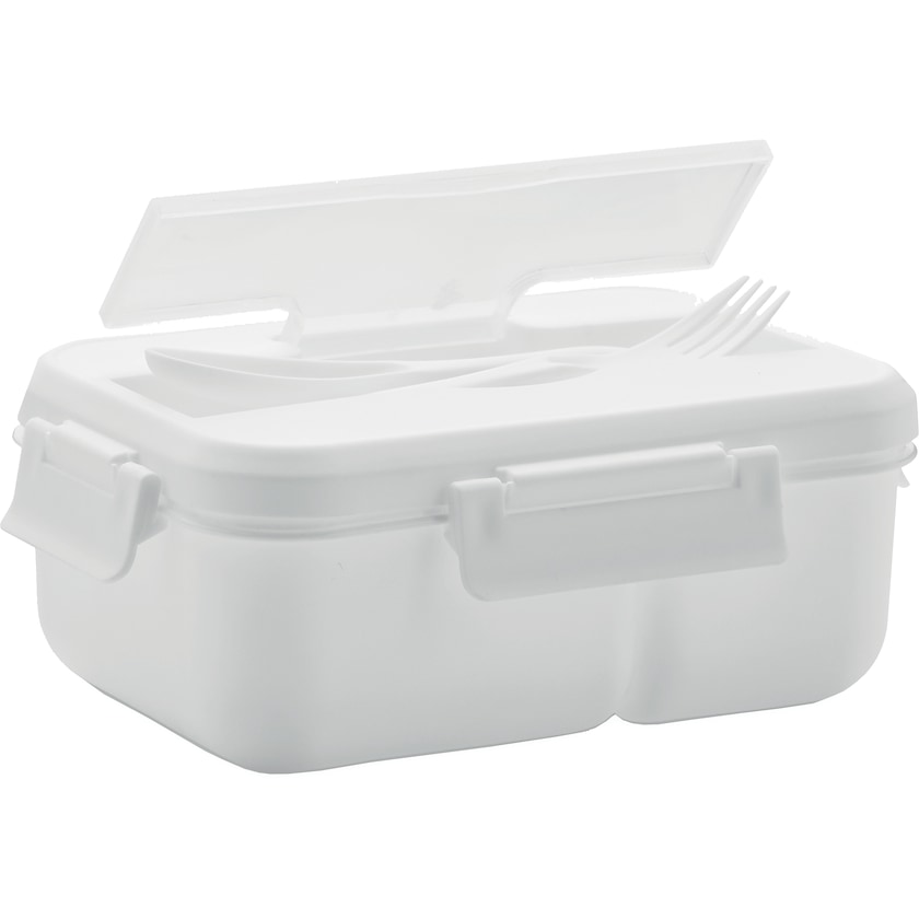 Grande boîte repas avec couverts inclus. Grâce aux deux compartiments séparés, les aliments ne se mélangent pas. Parfait pour un déjeuner au bureau comme pour un pique-nique.