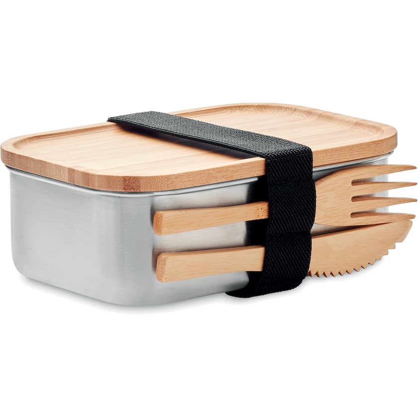 Boîte repas en acier inoxydable avec couvercle en bambou. Couteau et fourchette en bambou incluses. Le couvercle est maintenu en place avec une bande élastique noire en polyester.
