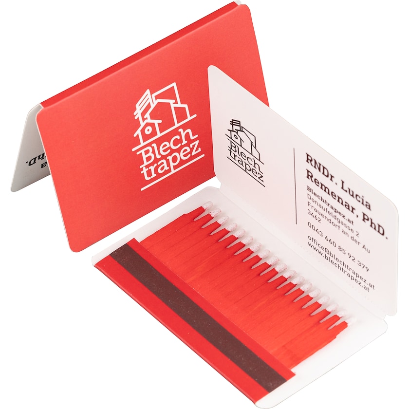 Boîte d'allumette de portefeuille : de la même forme et de la même taille qu'une carte de crédit. Ce format offre un espace généreux pour votre impression. Contient 18 allumettes. Vous pouvez choisir librement parmi 16 couleurs de bouts et 7 couleurs de bois. L'impression est réalisée en quatre couleurs maximum selon l'échelle Pantone et les couleurs supérieures en CMJN.