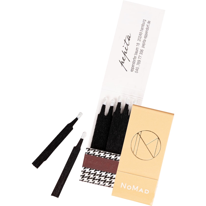 Petit étui d'allumettes avec dix allumettes sur deux rangées. Vous concevez vous-même l'étui. Vous pouvez choisir librement parmi 16 couleurs d'embouts différentes et 7 couleurs de bois différentes.