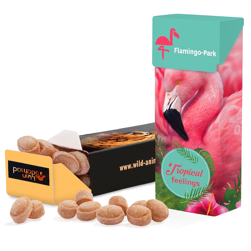 Boîte de bonbons moderne remplie de 25 grammes de bonbons de haute qualité. La boîte est marquée par impression digitale et entourée d'une film protecteur en cellophane. Vous concevez librement le design de la boîte (voir template d'impression).