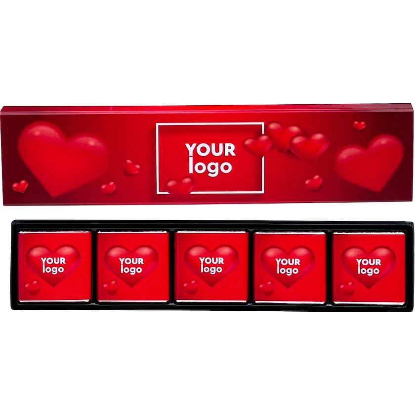 Boîte de chocolat avec 5 carrés de chocolat. La boîte de chocolat et les carrés de chocolat sont imprimés selon vos souhaits. Choisissez entre le chocolat au lait ou le chocolat noir.