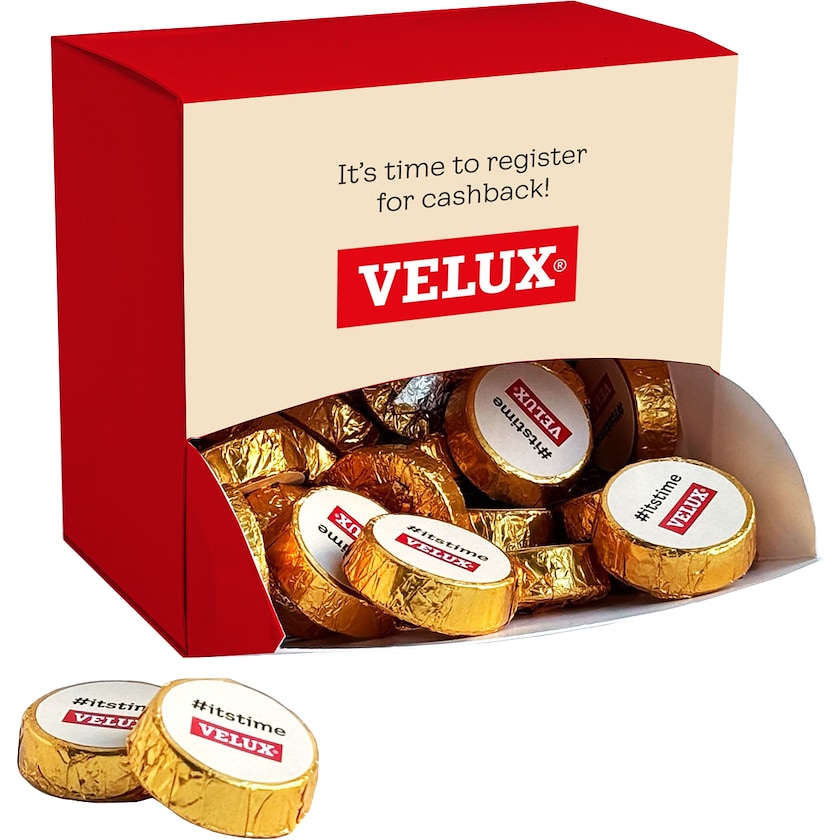 Petite boîte en carton remplie de morceaux de chocolat ronds en feuille d'or. Les morceaux de chocolat contiennent 50 % de cacao et ont un goût délicieux. Les tarifs d'impression se réfèrent à l'impression sur tout l'extérieur de la boîte en carton ainsi qu'à l'impression sur l'étiquette des morceaux de chocolat.