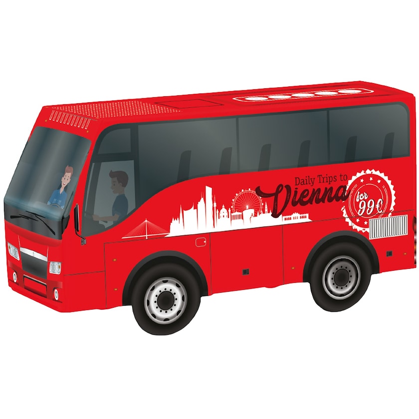 Bus rempli de bonbons ou de chocolats. Le bus est fabriqué en papier certifié FSC et personnalisé entièrement suivant vos souhaits. Vous pouvez choisir librement parmi les fourrages suivants : Mentos chewy candy (36,5 grammes, durée de conservation 12 mois), Ritter Sport chocolate bites (60 g, durée de conservation 6 mois) ou Lindt Lindor milk balls (50 grammes, durée de conservation 6 mois).