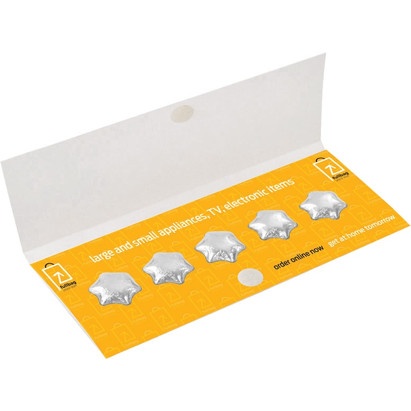 Boîte de cinq étoiles en chocolat au lait de haute qualité. Toute la boîte de chocolats est personnalisée suivant vos souhaits. Choisissez entre un papier d'aluminium rouge, argenté ou doré.
