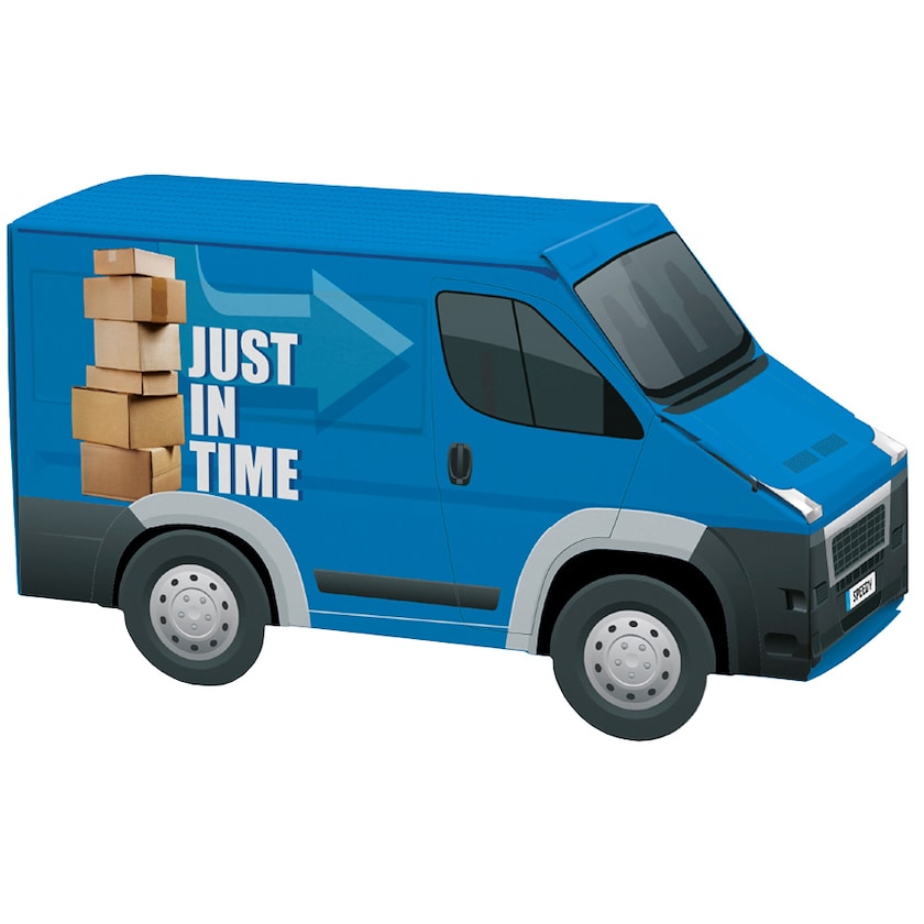Camionnette personnalisée remplie de bonbons ou de chocolats. La fourgonnette est fabriquée en papier certifié FSC et personnalisée entièrement suivant vos souhaits. Vous pouvez choisir librement parmi les fourrages suivants : Mentos chewy candy (36,5 grammes, durée de conservation 12 mois), Ritter Sport chocolate bites (60 g, durée de conservation 6 mois) ou Lindt Lindor milk balls (50 grammes, durée de conservation 6 mois).