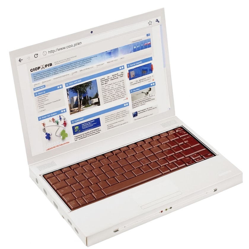 Boîte de chocolats en forme d'ordinateur portable. Le chocolat lui-même est en forme de clavier. L'intégralité de la boîte est conçue et personnalisée suivant vos souhaits. Une boîte de chocolats fun pour toutes les entreprises informatiques!