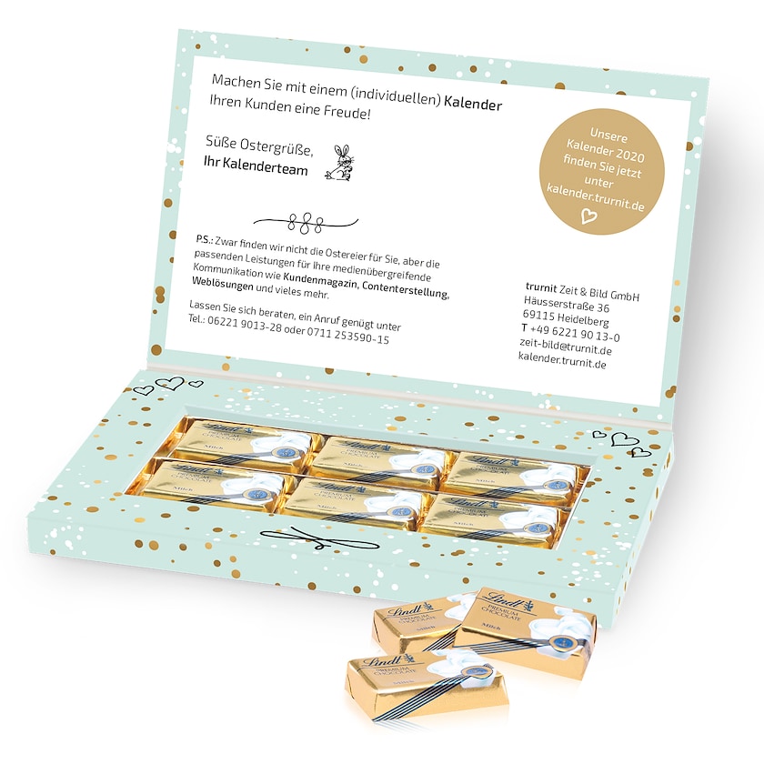 Boîte de chocolats remplie de délicieux chocolats au lait Lindt. La boîte de chocolats est imprimée en 4 couleurs entièrement suivant vos souhaits.