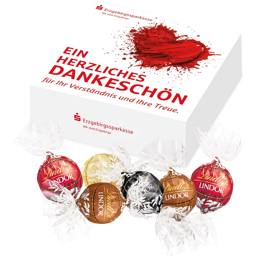 Boîte cadeau avec imprimé personnalisé contenant 6 chocolats Lindor. Les chocolats ont différents goûts : chocolat au lait, chocolat blanc, noisettes et chocolat noir. Une boîte de chocolat luxueuse au contenu incroyablement délicieux!