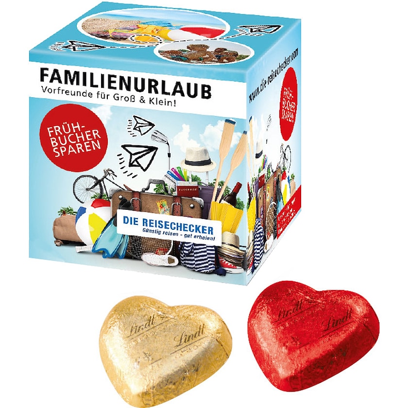 Petite boîte cadeau avec imprimé personnalisé remplie de 5 cœurs en chocolat Lindt. Tous les côtés des boîtes en carton sont personnalisés par impression photo 4 couleurs. Une petite boîte de chocolats remplie d'amour et de délicieux chocolat au lait.