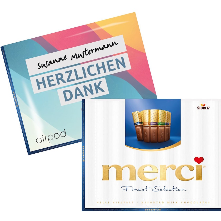 La boîte de chocolats Merci la plus vendue avec une boîte extérieure avec votre propre impression. La boîte de chocolat contient 250 grammes de chocolat aux saveurs nougat, chocolat au lait, amande, crème au café, pâte d'amande, chocolat au lait noir, mousse noire et praliné au lait.