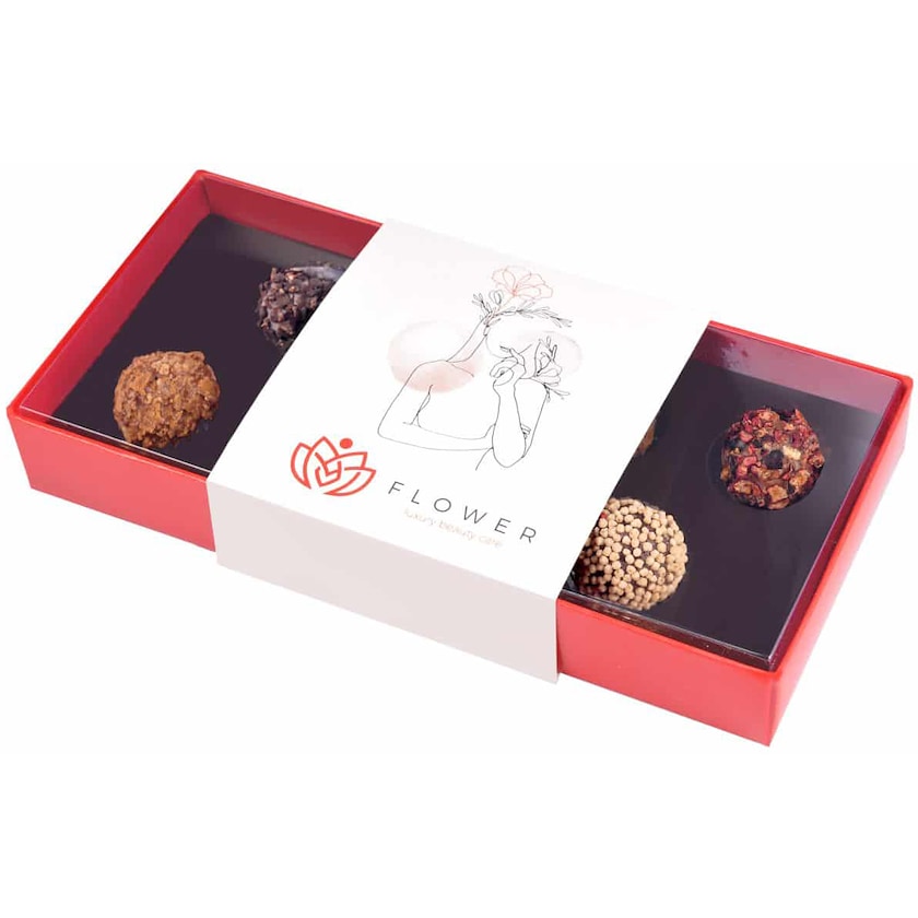 Boîte de 8 délicieuses truffes au chocolat. Les truffes au chocolat se décline en plusieurs parfums comme cherry, dark orange, zabaglione ou caramel. Autour de la boîte est placée une banderole, entièrement personnalisable suivant vos souhaits. Vous choisissez également la personnalisation de la boîte en carton et de son intérieur.