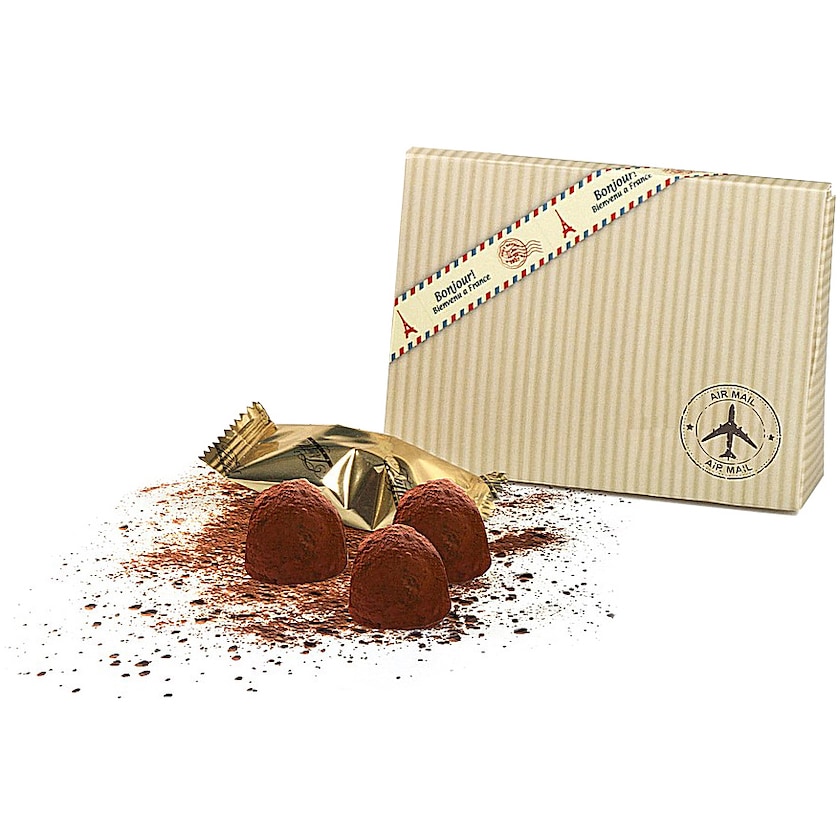 3 truffes au chocolat dans une boîte en carton avec imprimé personnalisé. Les truffes au chocolat sont produites en France à partir d'un chocolat noir de première classe. La boîte en carton est personnalisée entièrement suivant vos souhaits. Un cadeau parfait pour tous les clients importants!