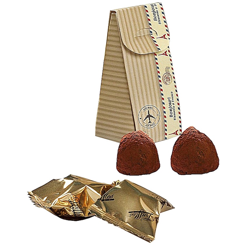 1 truffe au chocolat dans une boîte en carton avec imprimé personnalisé. Les truffes au chocolat sont produites en France et fabriquées dans un chocolat noir de première classe. La boîte en carton est personnalisée par impression photo en quadrichromie, et conçue entièrement suivant vos souhaits.