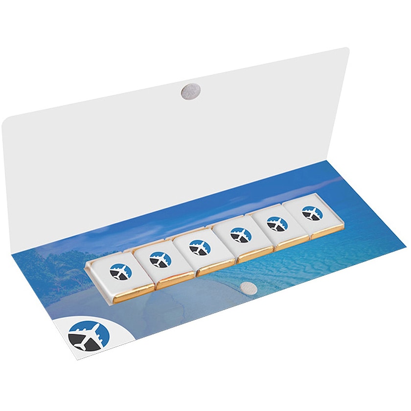 Boîte de chocolats avec 6 morceaux de chocolat. Chaque morceau de chocolat pèse 7,5 grammes et est disponible dans les goûts chocolat au lait et chocolat noir (72% de cacao). Le papier d'aluminium autour des chocolats est disponible en doré ou argenté. La boîte de chocolats et les papiers d'emballage sont personnalisés par impression photo 4 couleurs suivant vos souhaits. Téléchargez les templates d'impression et concevez une boîte de chocolats vraiment unique!